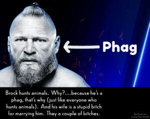 Everyone who hunts animals is a phag.  Can’t wait to see another 0.5-star match from Brock at ‘Mania, by the way.