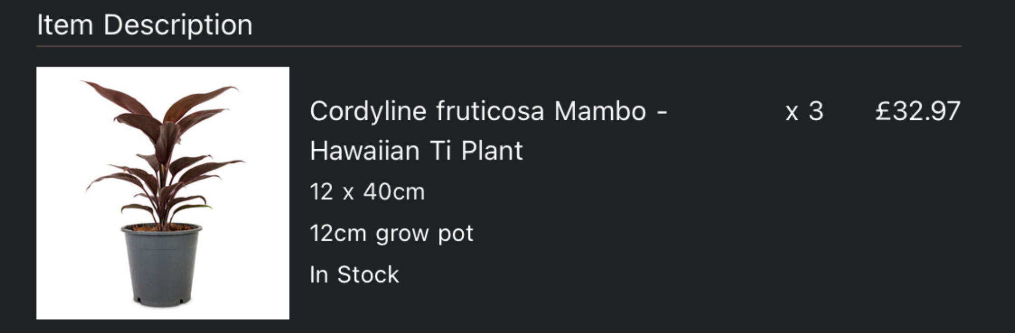 Today, I ordered my first ever plants, which are 3 Hawaiian Ti plants, each approximately 40cm tall, apparently.