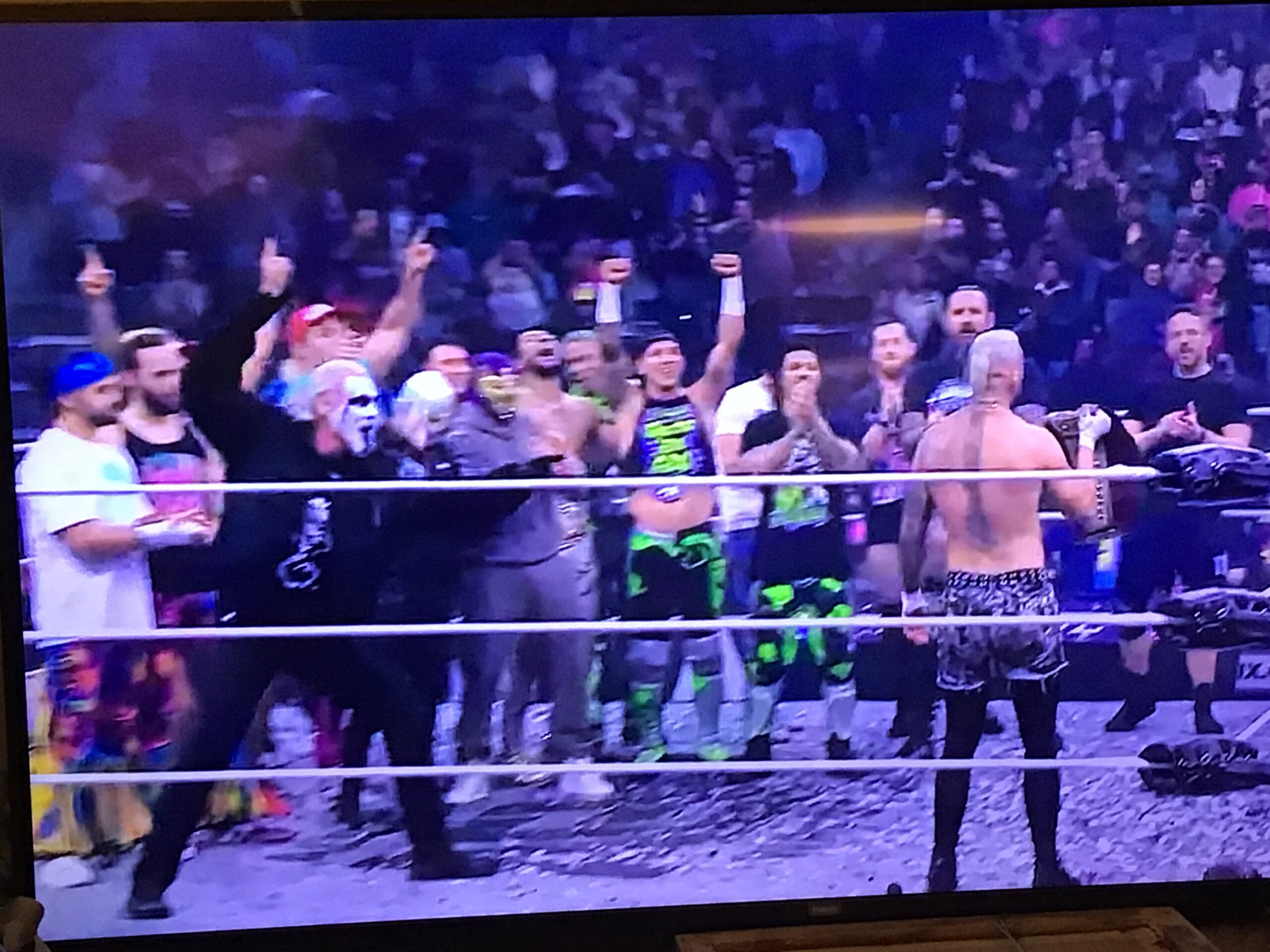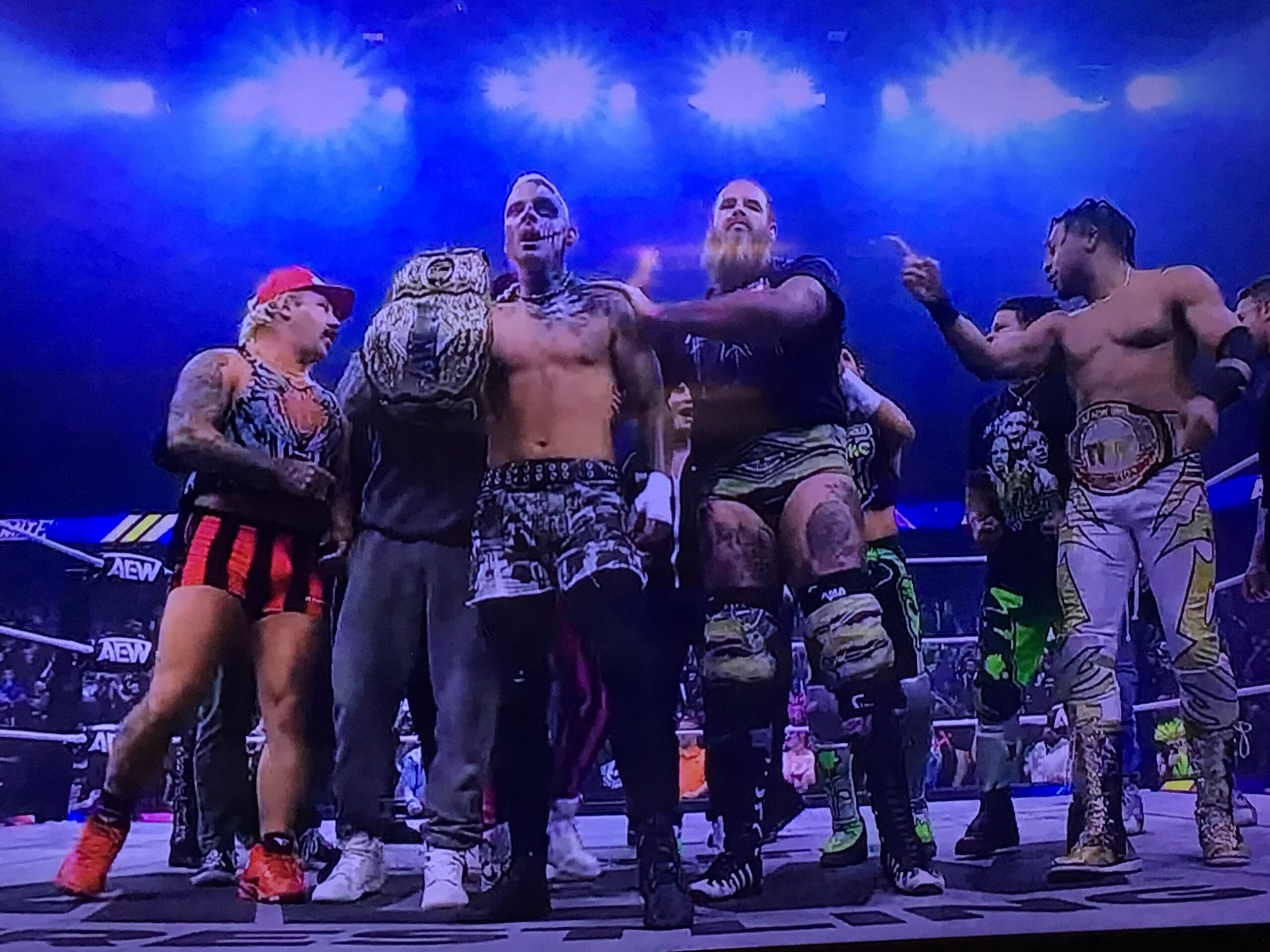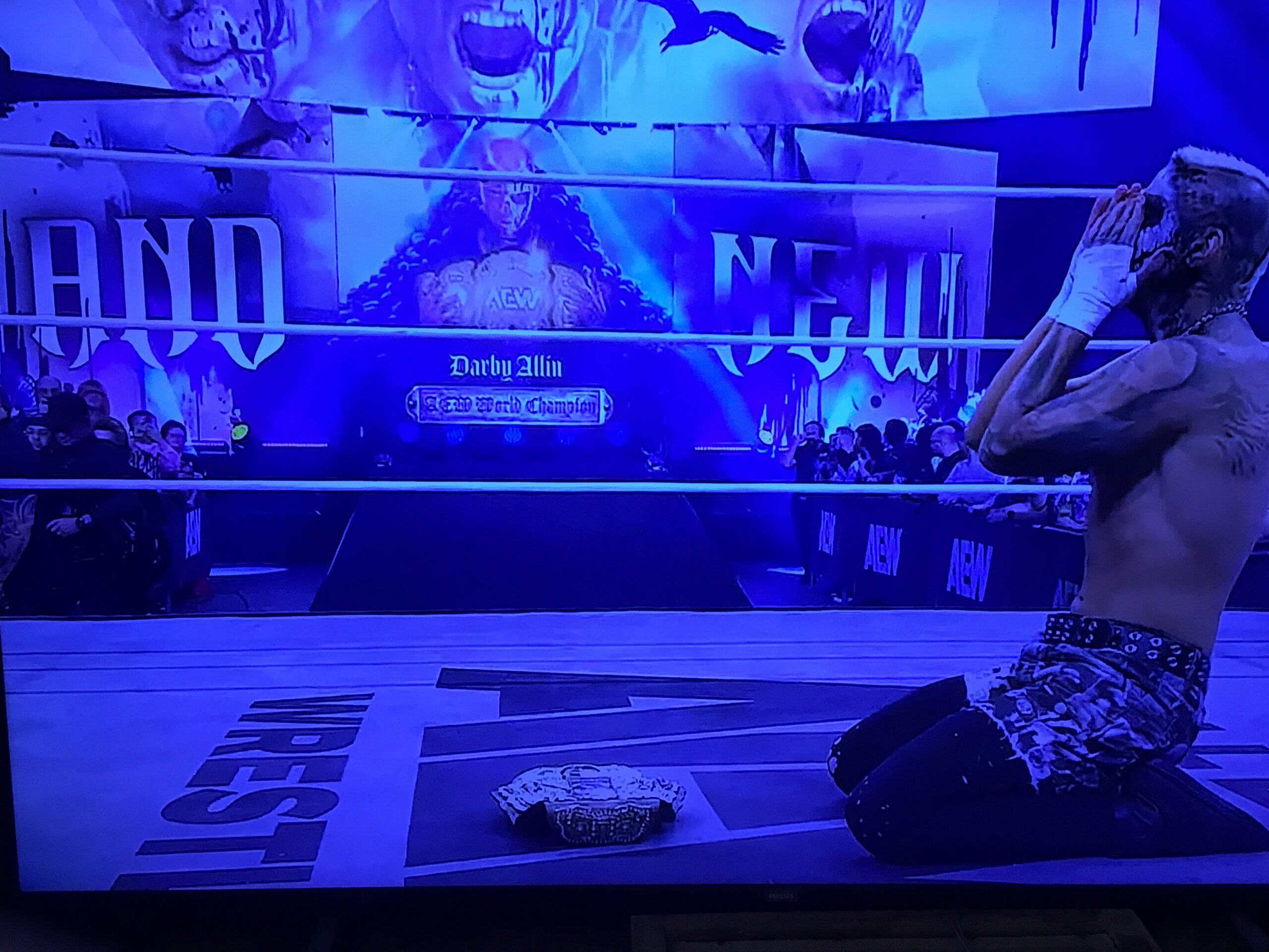 Darby just beat MJF for the AEW World Championship.  I don’t want to sound like I am sucking up to Darby Allin, but, despite him being only 33 years of age, I think he is already one of the top-15 pro-wrestlers of all time, and, let’s be honest, he is the new Mick Foley, and has been for the past 10 years or so, crazy bumps and all.  Darby is very, very deserving of this AEW World Title win, so I think that this is a beautiful moment for pro-wrestling.  In the post-match celebrations, Darby humbly refused to lift the belt above his head to celebrate.