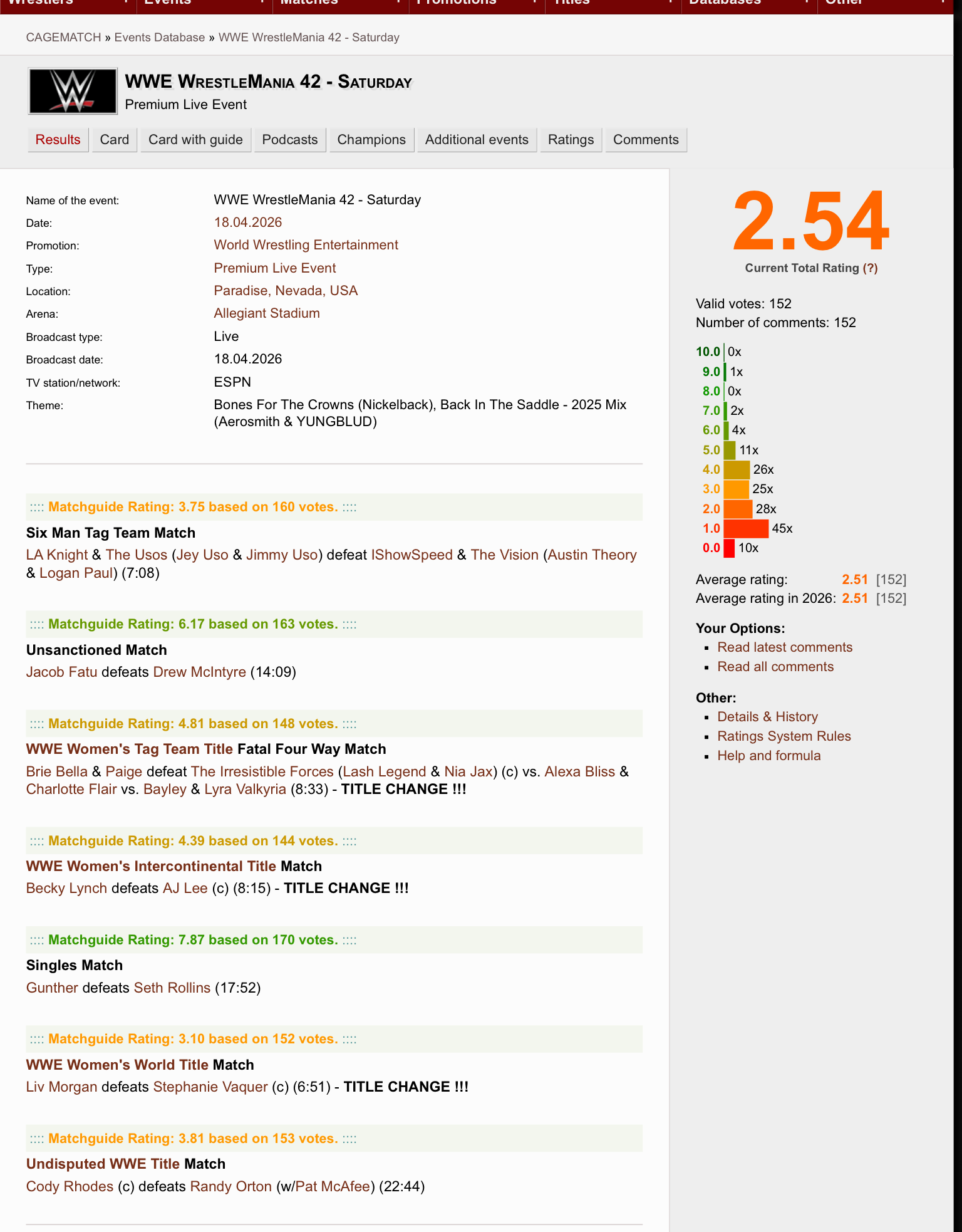 Oh dear.  Night 1 of WrestleMania 42 is not getting good reviews from wrestling fans.  This screenshot from CageMatch sums it up.